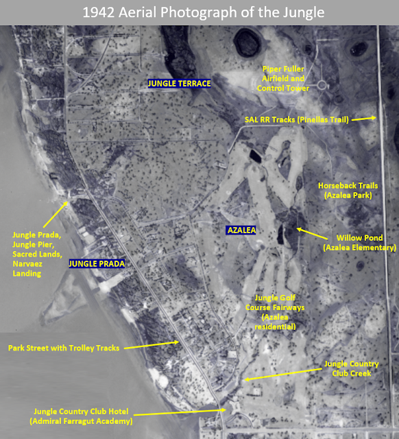 The Jungle extends across two square miles of land on the west side of St. Petersburg, Florida bounded by Tyrone Blvd (N), Boca Ciega Bay (W), 5th Avenue North (S), and the Pinellas Trail (E). It includes the current day neighborhoods of Azalea, Jungle Prada and Jungle Terrace.